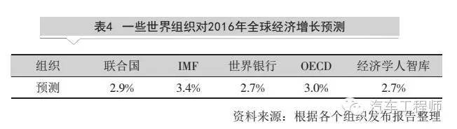 綜合這些因素,全球汽車市場將繼續(xù)保持微弱增長態(tài)勢,一些預(yù)測機(jī)構(gòu)對2016年增長率的預(yù)測也大致保持在2.5%~3%之間:杜伊斯堡-埃森大學(xué)汽車研究所認(rèn)為在低油價的刺激下,2016年全球小汽車新車銷量將額外增加60萬輛,整體比2015年增長2.5%;標(biāo)準(zhǔn)普爾預(yù)計2016年全球汽車銷售量將增長3%左右; 《經(jīng)濟(jì)學(xué)人》 預(yù)計2016年全球汽車市場銷量將增長3.1%左右。